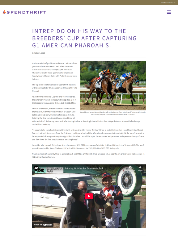 Maximus Mischief got his second Grade 1 winner of the year Saturday at Santa Anita Park when Intrepido closed with a rush to win the $300,000 American Pharoah S. (G1) by three-quarters of a length over heavily favored Desert Gate, with Plutarch a nose back in third.