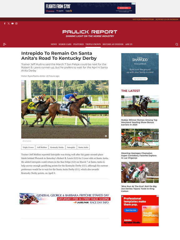Trainer Jeff Mullins reported Intrepido was doing well after his game second-place finish behind Plutarch in Saturday’s Robert B. Lewis (G3) for 3-year-olds at Santa Anita. He added Intrepido could return in the San Felipe (G2) on March 7 at Santa Anita to help accrue enough qualifying points for the Kentucky Derby (G1), although his current preference would be to wait for the Santa Anita Derby (G1), which also awards Kentucky Derby points, on April 4.