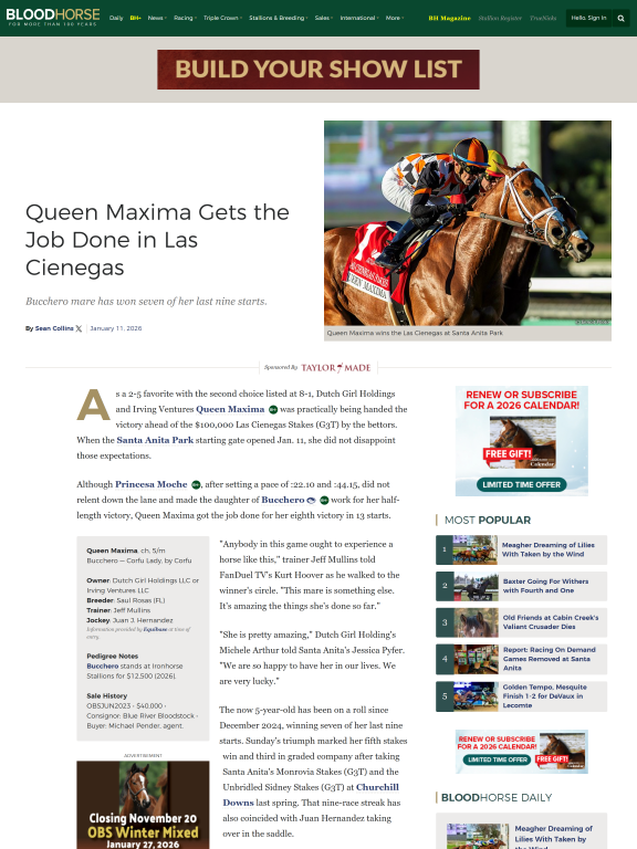 As a 2-5 favorite with the second choice listed at 8-1, Dutch Girl Holdings and Irving Ventures Queen Maxima was practically being handed the victory ahead of the $100,000 Las Cienegas Stakes (G3T) by the bettors. When the Santa Anita Park starting gate opened Jan. 11, she did not disappoint those expectations.