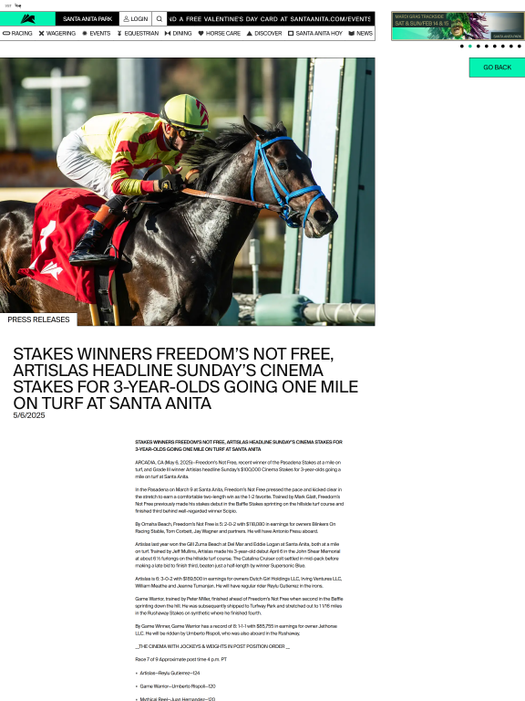 Stakes Winners Freedom’s Not Free, Artislas Headline Sunday’s Cinema Stakes for 3-Year-Olds Going One Mile on Turf at Santa Anita