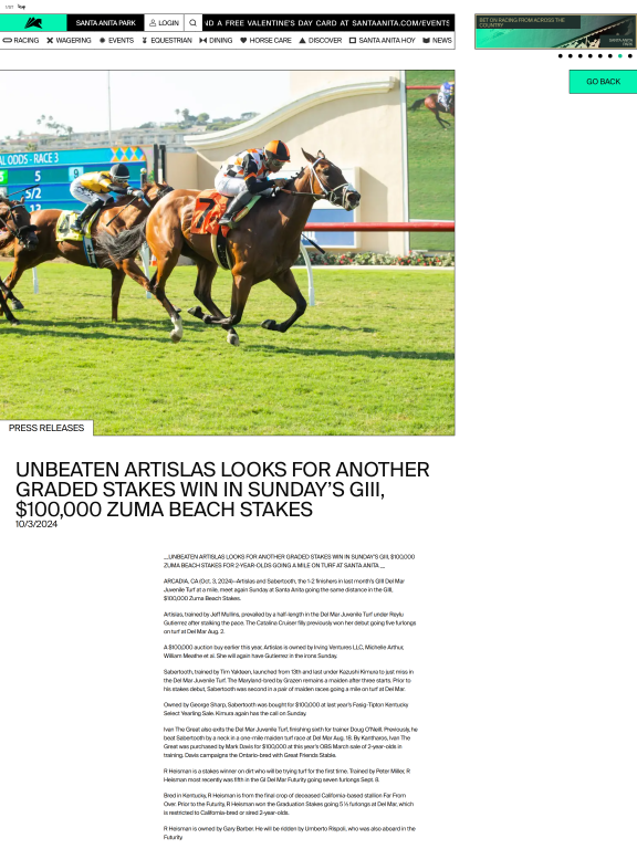 Artislas and Sabertooth, the 1-2 finishers in last month’s GIII Del Mar Juvenile Turf at a mile, meet again Sunday at Santa Anita going the same distance in the GIII, $100,000 Zuma Beach Stakes. Artislas, trained by Jeff Mullins, prevailed by a half-length in the Del Mar Juvenile Turf under Reylu Gutierrez after stalking the pace. The Catalina Cruiser filly previously won her debut going five furlongs on turf at Del Mar Aug. 2.